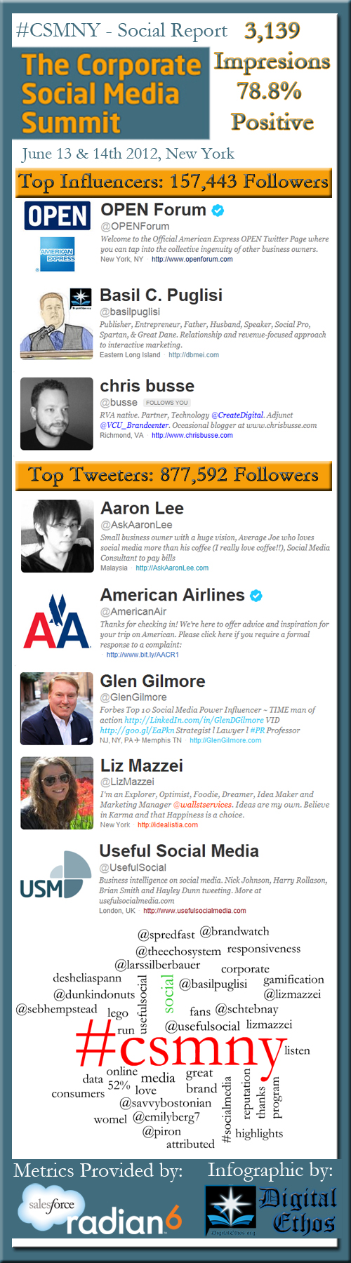 Speakers included Dino Dogan (Triberr), Gemma Craven (Ogilvy), Christine Murphy (DDB), Ric Dragon (DragonSearch), Marc Fischman (Hyperactivate), Gabriel Shaoolian (Blue Fountain Media), Cynthia Sanchez (Oh So Pinteresting), Melonie Dodaro (TopDog Social Media), Amy Vernon, Hilary Topper, and Brian Solis (Altimeter Group).