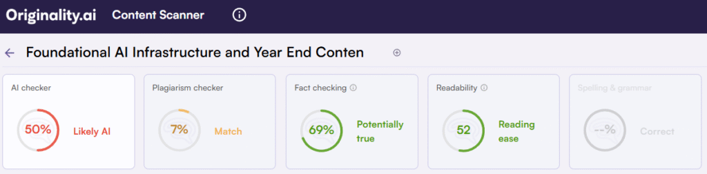 Authenticity checks sit inside that same loop. Originality.ai’s benchmark report pegs overall accuracy near ninety seven percent, and it notes how quickly AI content volume has climbed on major platforms. Treat detection as a spot check. Run pre publish scans on high stakes assets, keep an evidence log that ties every claim to a source, and reserve final judgment for editors who know the subject. Track false positives and false negatives on your own samples, the percentage of assets that clear review on the first pass, and complaint rates after publication.