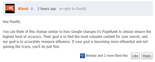 Klout’s position is that it has made changes to better reflect influence. In one comment, Klout compares itself to Google and the need to update algos for the purpose of producing better Page Ranking results. In the mean time, Klout finds itself in a rough spot having to explain to its big brand clients that they in fact might not have reached the right people.