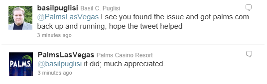 The social media team at the Palms shared that they are having issues finding any problem because the website is working on location, then they ask about what browser I am using. I quickly run the gauntlet using Chrome, IE and Firefox to confirm it’s not a browser issue, then after contacting several others at different locations and confirmed to @PalmsLasVegas the issue is not isolated or browser related. Within a few minutes the Palms website is live again and confirmed that they did have an issue and they “appreciated” the info.