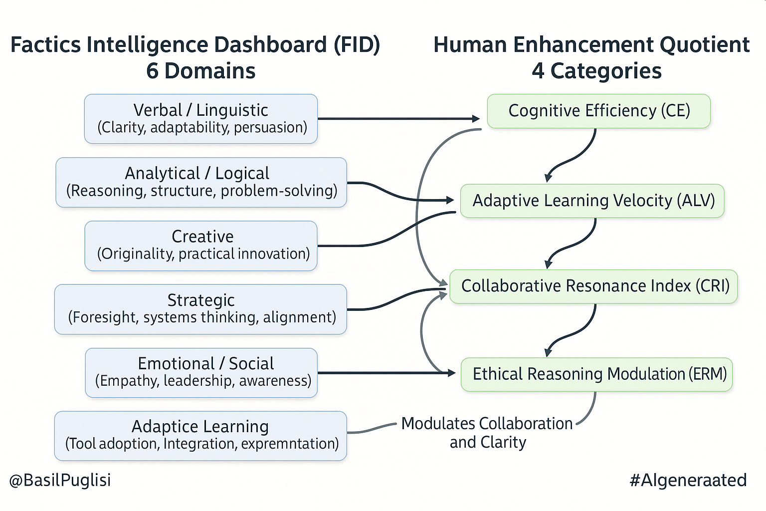 The Factics Intelligence Dashboard, or FID, was created to measure applied intelligence. It mapped how humans think, learn, and adapt when working alongside intelligent systems rather than in isolation. Its six domains (Verbal, Analytical, Creative, Strategic, Emotional, and Adaptive) were designed to evaluate performance as evidence of intelligence. It showed how collaboration could amplify precision, clarity, and insight (Puglisi, 2025a).